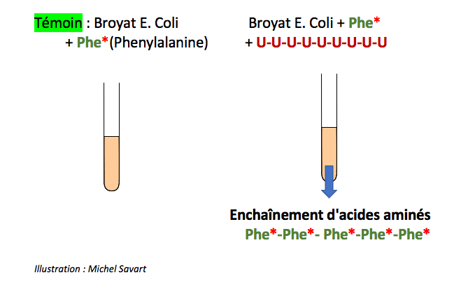 Ils ont travaillé sur des broyats de bactéries Escherichia Coli dont ils ont ôté l’ADN et auxquels ils ont rajouté un ARN de synthèse contenant une succession de bases U (U = Uracile) et des acides aminés marqués radioactivement*.