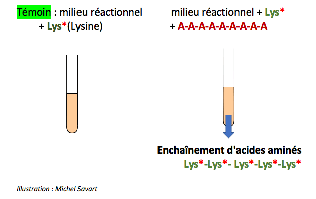 Ils viennent de créer une protéine de synthèse constituée exclusivement de phenylalanine. Ils n’observent aucun autre enchaînement avec les autres acides aminés. Ils en concluent que l’enchaînement des acides aminés Phe-Phe-Phe-Phe-Phe dépend strictement de la succession des bases U dans cet ARN de synthèse.