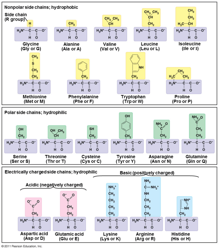 Les acides aminés possèdent à la fois un groupement acide et un groupement aminé (rectangles violets), d’où leur nom. Dans les autres rectangles (jaunes, verts, roses et bleus) sont représentés les vingt groupes latéraux qui confèrent à chaque acide aminé une propriété chimique particulière et déterminent la structure en 3D des protéines.