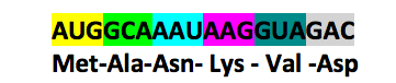 - Après lecture du tableau à trois entrées, on peut positionner sous chaque triplet les acides aminés: Méthionine (Met)-Alanine (Ala)-Asparagine (Asn)-Lysine (Lys)-Valine (Val)-Acide aspartique (Asp).