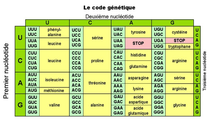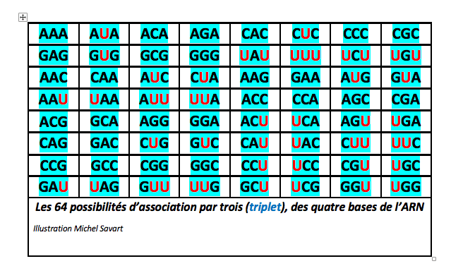 A partir des quatre bases de l’ADN (A,T,G,C) il existe 64 possibilités de former des triplets (43 = 4 x 4 x 4). Il en est de même pour l’ARN (A,U,G,C). La seule différence étant que dans l’ARN, le T (Thymine) de l’ADN est remplacé par un U (Uracile)