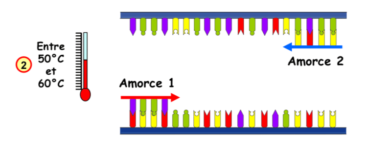 Une fois la double hélice ouverte, la deuxième étape consiste à abaisser la température du milieu pour permettre la fixation d’une paire d’amorces de synthèse sur les brins d’ADN. Les amorces sont constituées d’une séquence d’une vingtaine de bases (A,T,G,C) qui vont encadrer la zone d’ADN à amplifier. Cette étape de fixation des amorces est appelée hybridation.
