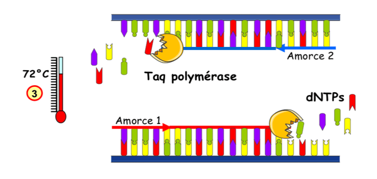Au cours de la troisième étape la température du milieu réactionnel est portée à 72°C pour permettre l’action de la Taq polymérase. Durant cette étape les bases (A,T,G,C,), ajoutées dans le milieu sous forme de nucléotides, se positionnent devant les bases correspondantes des zones à amplifier. Les nucléotides sont ensuite reliés entre eux pour former un nouveau brin d’ADN.