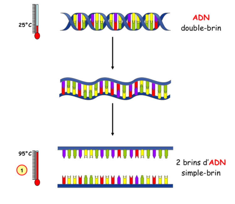 La première étape consiste à ouvrir la double hélice d’ADN en portant la température du milieu à 95°C.