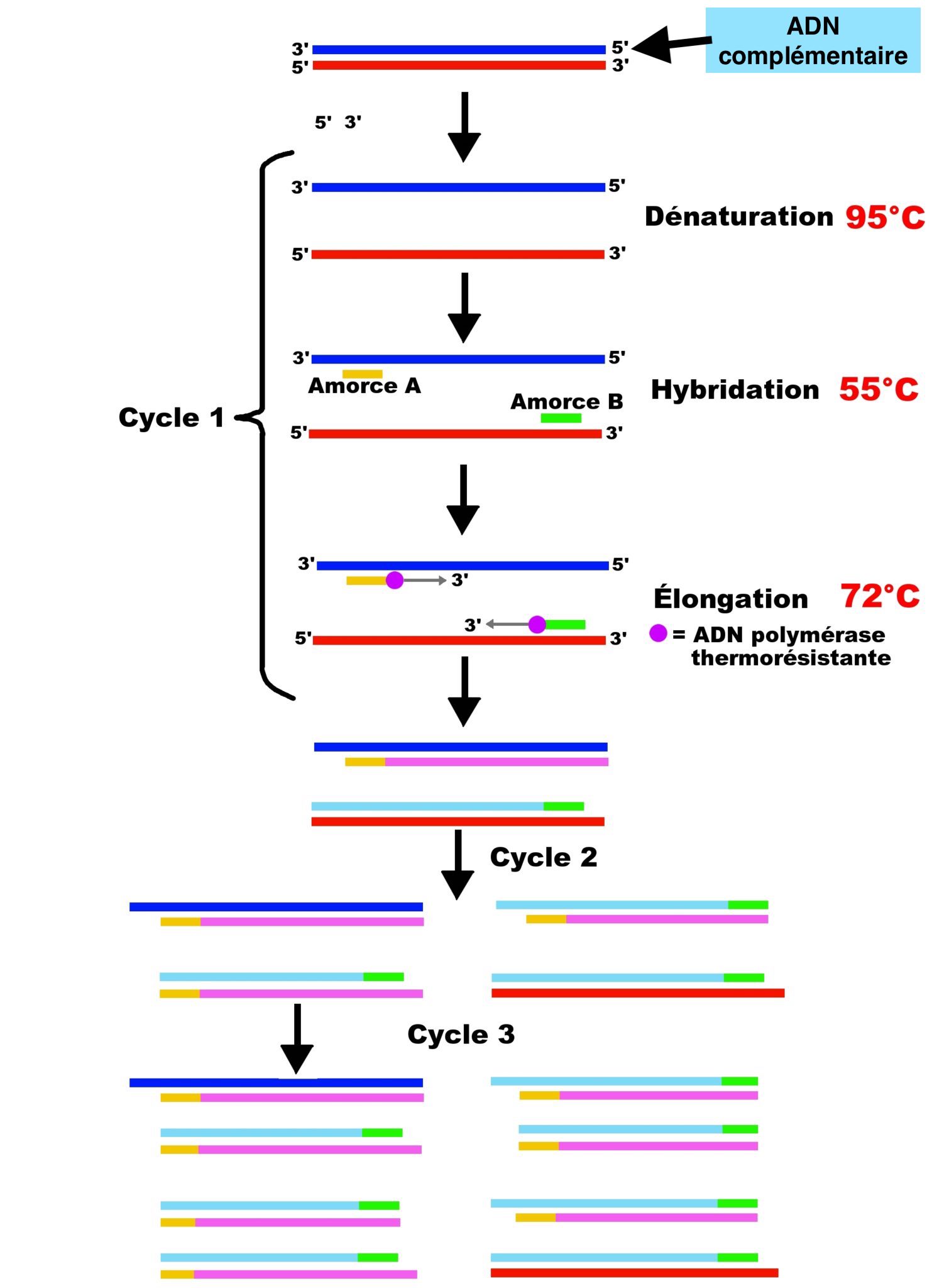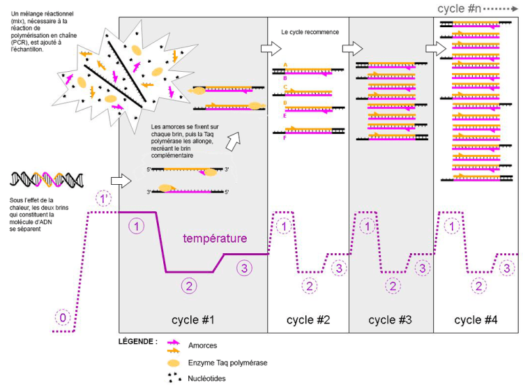 Les changements de température correspondant à ces trois étapes sont réalisés avec un thermocycleur. Ces appareils contiennent des porte-échantillons métalliques couplés à un logiciel permettant de piloter les températures, les temps de chauffe et le nombre de cycles à effectuer.