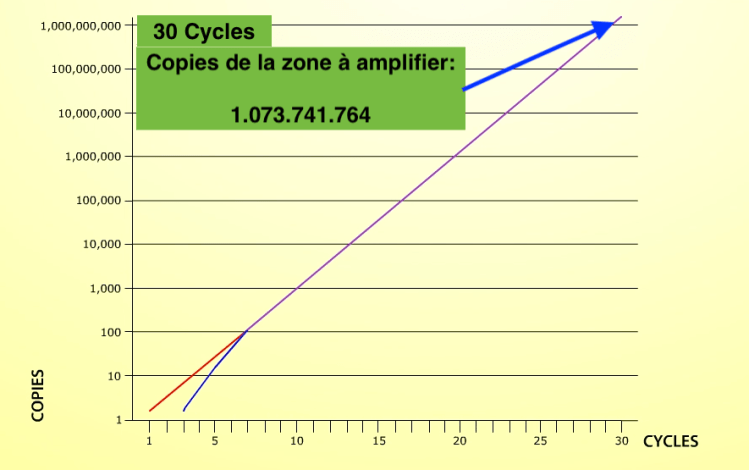 Comme présenté dans le graphe ci-dessous, pour 20 cycles, l’amplification sera de un million et pour 30 cycles elle avoisinera un milliard de copies.