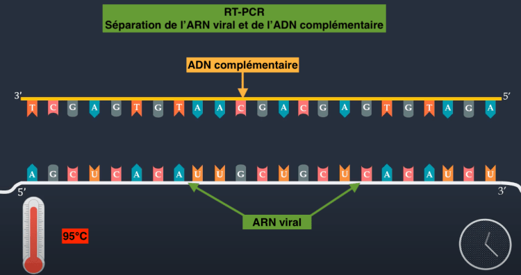 Après synthèse complète de l’ADN complémentaire, la température est portée à 95°C afin de le dissocier de l’ARN.