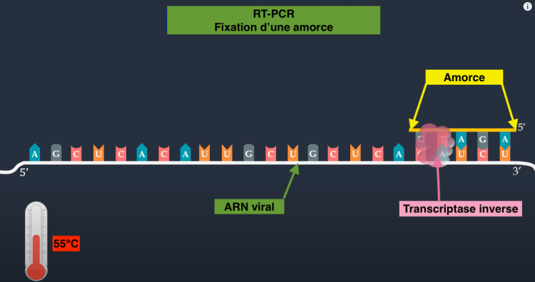 Comme pour la PCR classique, la mise en route de la transcription inverse nécessite l’utilisation d’amorces d’ADN afin de délimiter la zone de l’ARN à amplifier. La fixation de ces amorces s’effectue autour de 55°C.