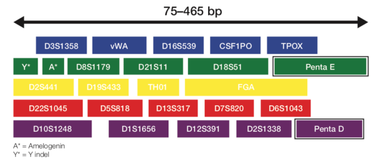 La figure ci-dessous constitue un exemple des zones (loci) analysées en identification humaine. Les numérotions de type D3, D16, D8 … correspondent aux chromosomes 3, 16, 8 … Les zones Y, A (amélogénine) permettent le sexage des individus.