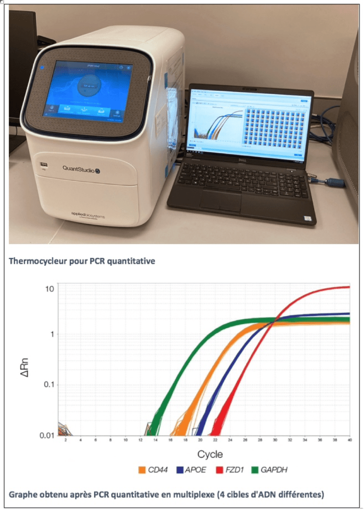 La PCR en temps réel, aussi appelée PCR quantitative, permet de déterminer la présence et la concentration d’une séquence d’ADN cible dans un échantillon. Cette technique quantitative utilise des sondes fluorescentes pour suivre, à chaque cycle, la quantité de produit formé. Elle peut être utilisée pour quantifier différentes cibles d’ADN en même temps, c’est à dire en multiplexe.
