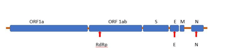Dans l’exemple présenté ci-dessous les flèches rouges indiquent les gènes du coronavirus qui vont être ciblés par les amorces. Généralement, le gène S qui porte l’information pour la pointe de fixation du virus (Protéine spike) n’est pas ciblé, car c’est le gène qui mute le plus.