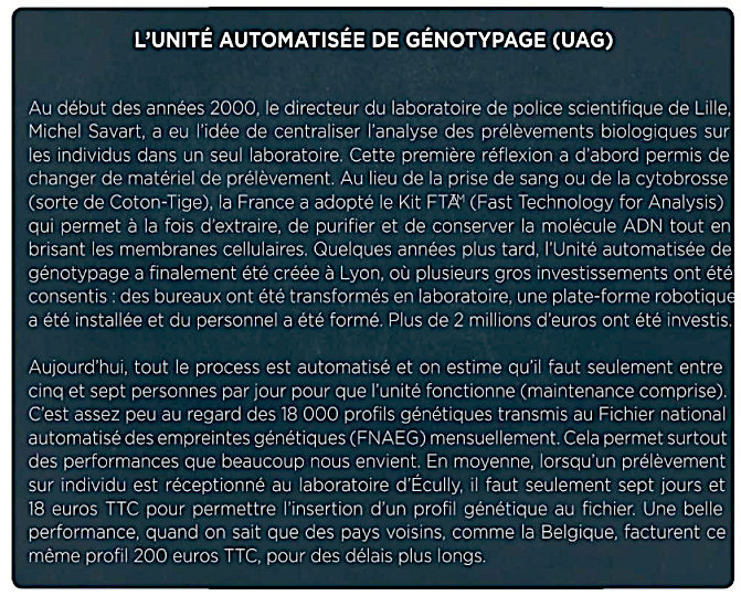 Ces supports facilitent la collecte, le transport, la purification et le stockage de l’ADN et de l’ARN sur le long terme et à température ambiante. Ils offrent également une compatibilité avec les systèmes robotisés dans le cadre des analyses PCR à haut débit. Au début des années 2000, en accord avec les représentants de la police et de la gendarmerie et dans la perspective de la mise en route du Fichier National des Empreintes Génétiques (FNAEG), j’avais donc préconisé leur utilisation en France pour tous les prélèvements sur individu.