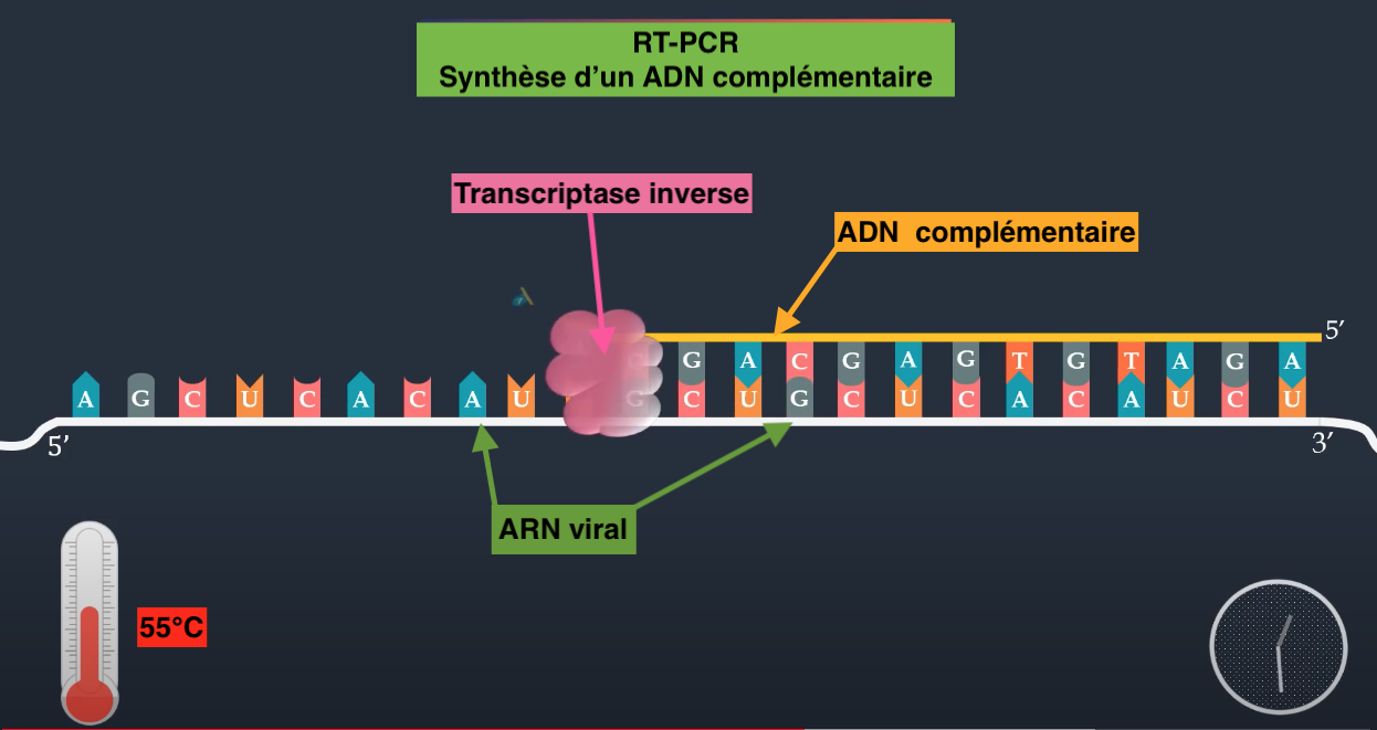 Le coronavirus Sars-Cov2 est un virus à ARN. Son identification par PCR nécessite donc une transformation préalable de séquences cibles de cet ARN en ADN. Cette transformation, dénommée transcription inverse, est réalisée avec une enzyme particulière, la transcriptase inverse.