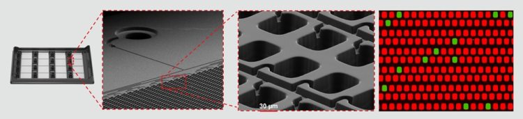 Zooms successifs sur une plaque de 20 480 micro-chambres (Thermofisher)